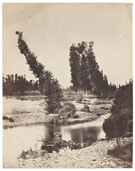 | Arbre penché et peupliers au bord d’une rivière, France | |