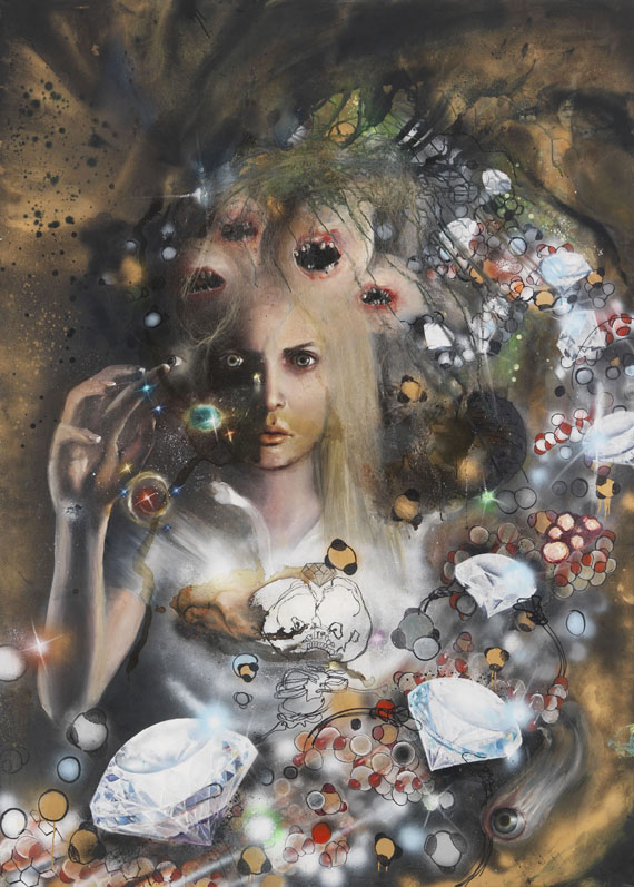 | Mixed Media Mixed media. Oil, gold paint, hair and Dammar gum varnish on canvas. | |
