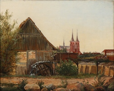 | Landscape with a watermill and Roskilde Cathedral in the background | |