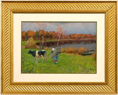 | autumn landscape with cow, woman carrying bundle of sticks | |