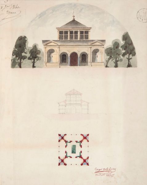Vignette showing the facade of a building, with architectural cross section and floorplan below,