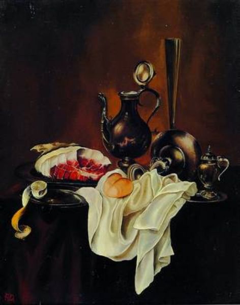 Stilleben mit Silberkanne und Schinken, Zinn und Zitrone