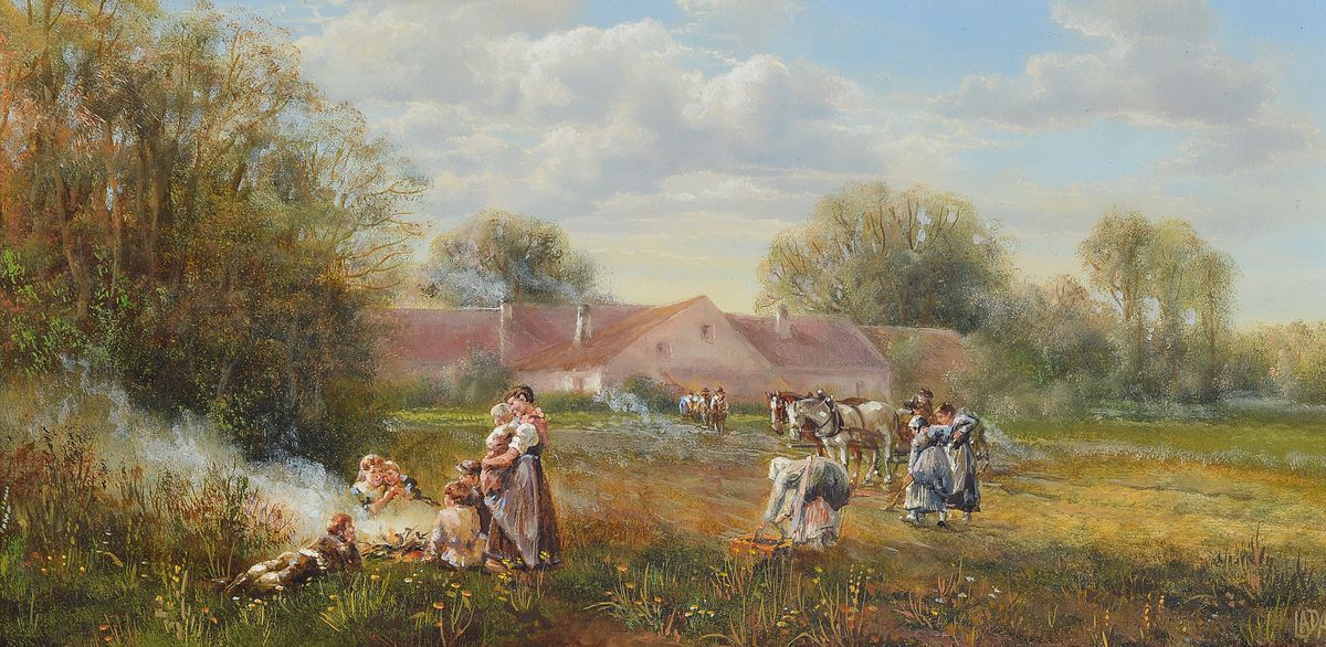 peasant family at the campfire in front of the farm, sideways horse-drawn vehicle and harvesting peasants