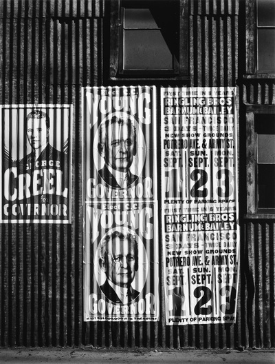 Political Signs and Circus Poster, San Francisco. Silver print, the image measuring 13 1/2x10 1/4 inches (34.3x26 cm.), the mount 20x16 inches (50.8x40.6 cm.), with Adams' signature, in pencil, on mount recto, and his Carmel hand stamp, with the titl | |