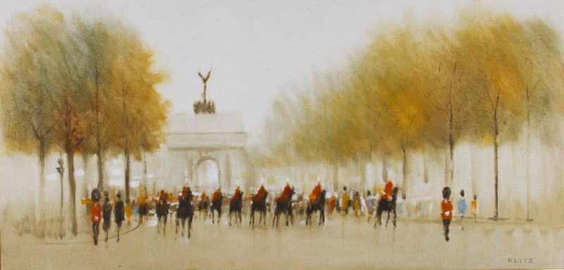 | London scene showing the Household Cavalry on parade at Hyde Park, with Wellington Monument beyond | |