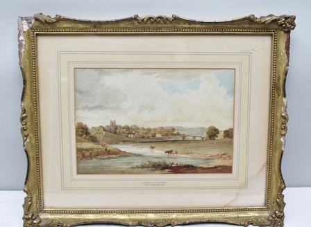 | St. Asaph, Flintshire, a landscape study with cattle watering in the foreground with views to distant village with church and ar | |