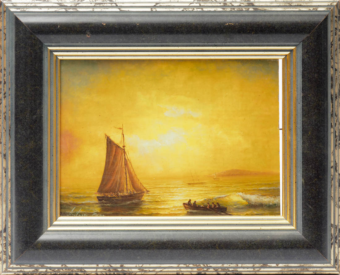 | Manned rowing boat, heading for a fishing boat in the evening sunlight | |