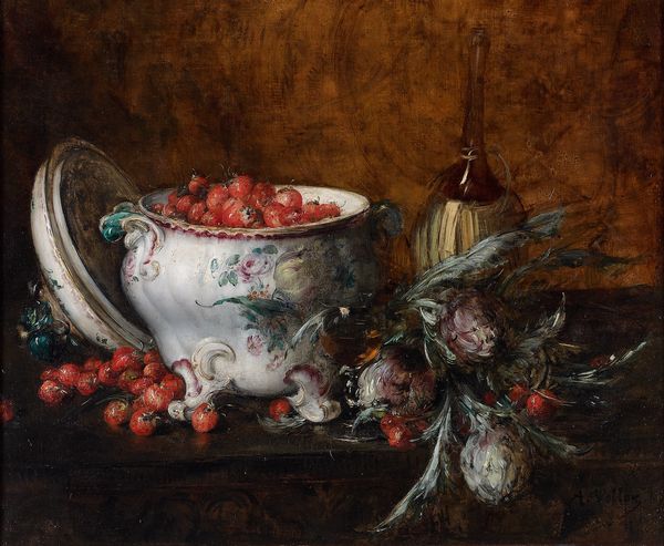 | NATURE MORTE AUX ARTICHAUTS ET AUX FRAISES DANS UNE TERRINE EN FAIENCE DE L'EST, 1879. | |
