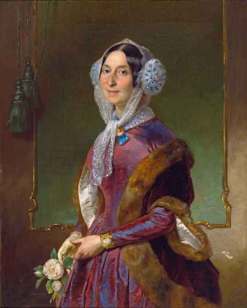 Dreiviertelportrait einer Dame im roten Seidenkleid.
