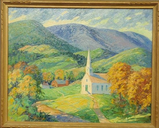landscape painting of a church and farm in autumn