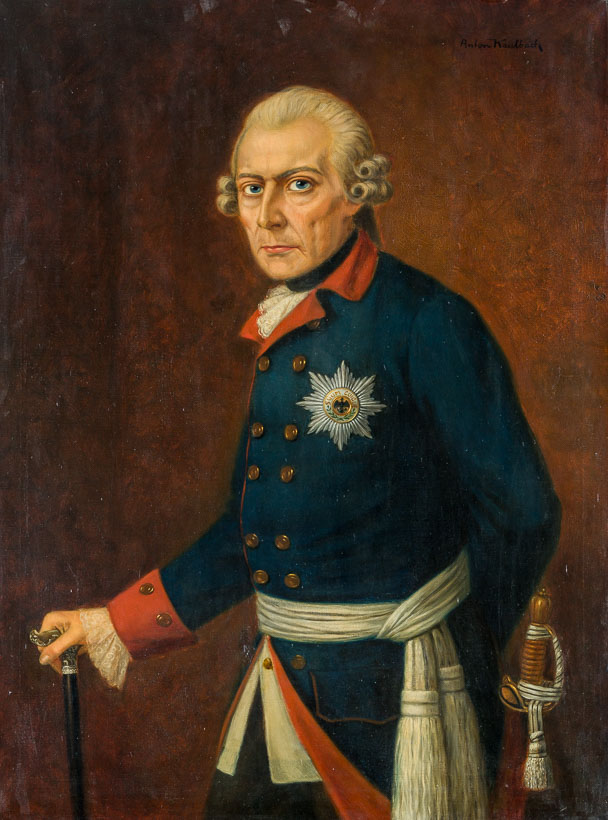| Friedrich d. Gr. in Uniform mit Bruststern des schwarzen Adlerordens. Barhäuptig, mit Krückstock. Hüftbildnis | |
