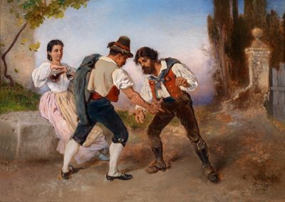 | Italian Peasants Playing Morra and a Peasant Woman with Wine Bottle | |