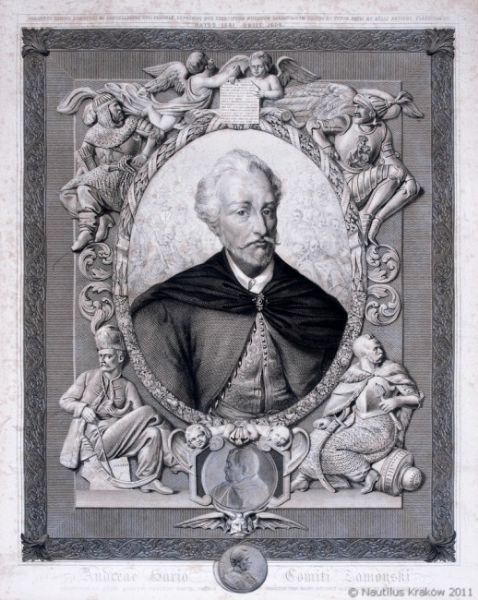 Portret historyczny Jana Zamoyskiego otoczonego współczesnymi znamienitościami
