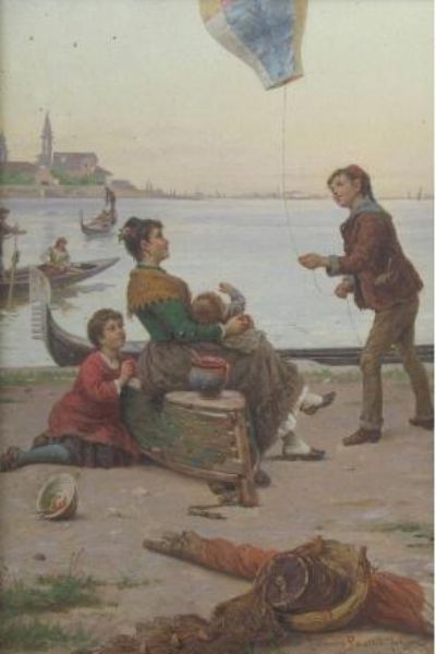 | Venetian scene with figures on the canal side, a boy flying a balloon, gondolas on the water | |
