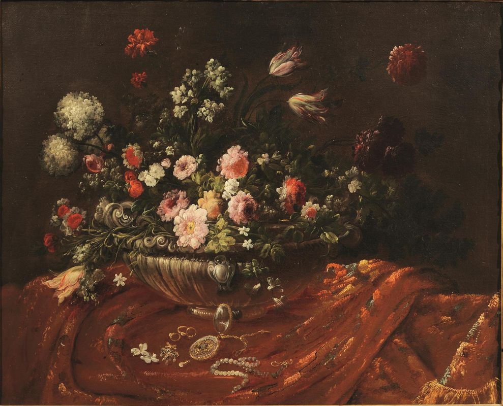 FIORI IN UN VASO D’ARGENTO, CON GIOIELLI SU UN DRAPPO