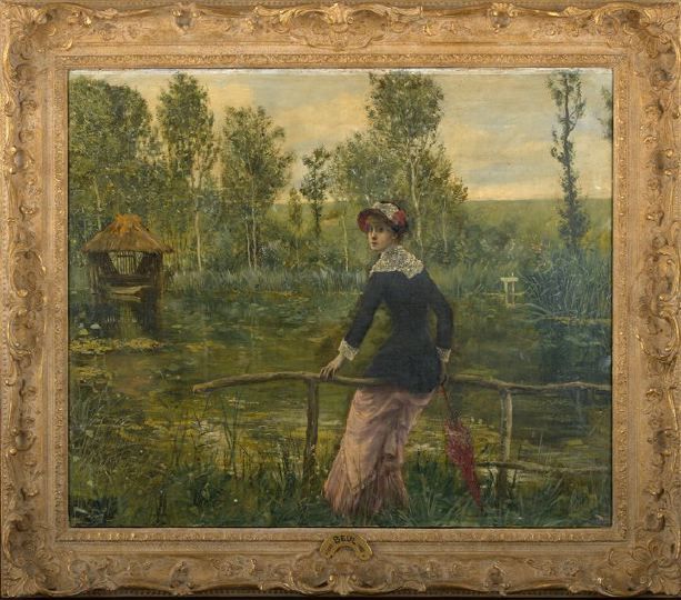 | Landscape with an Elegantly Dressed Lady Holding a Red Parasol and Seated Beside a Woodland Pond Strewn with Water Lilies | |