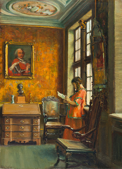 | Young letter-reader in Rococo interior with writing chest, chairs and paintings of a ruler | |