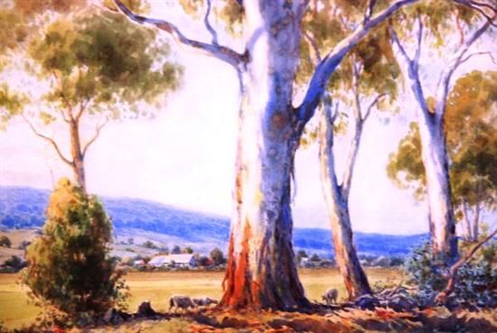 | Australian Landscape with Red Gums and Sheep and Farm Buildings in the Middle Distance | |