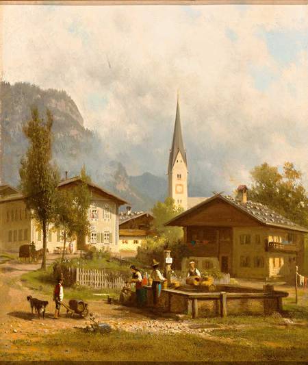 Plausch am Dorfbrunnen in malerischem Kirchdorf vor Gebirgskulisse