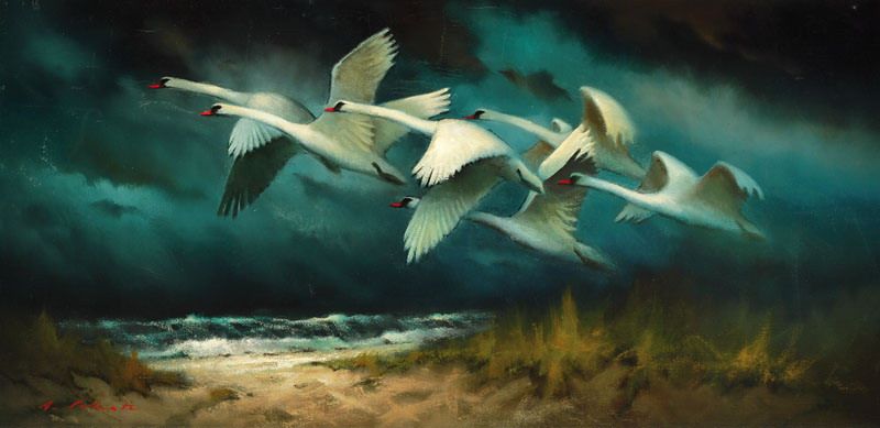 flying swans over the dunes