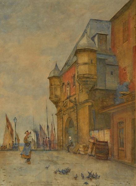 A continental harbourside town with figures