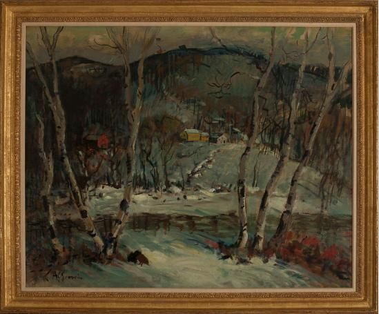 WINTER LANDSCAPE WITH FARMHOUSES AND BIRCHES.