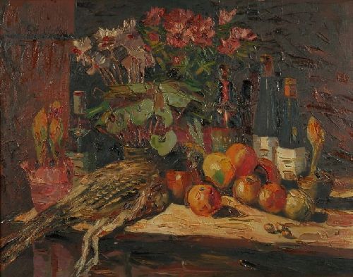 Stilleben mit Fasan, Wein und Äpfeln. 1927.