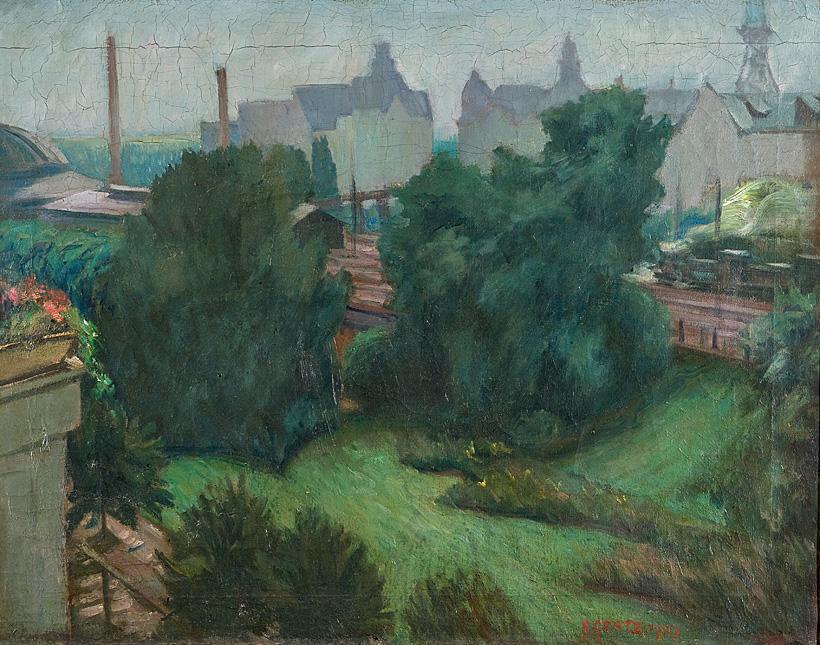 | Berlin, Bahnhof Westend. Blick auf den Bahnhof von blumengeschmückter Balkonecke. Über den Dächern der neu erbaute Funkturm | |