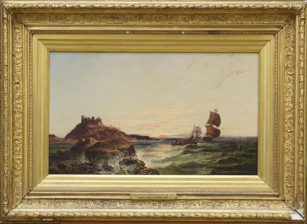 | view of the Farne Isle Rocks with Bamburgh Castle and sailing vessel beyond | |