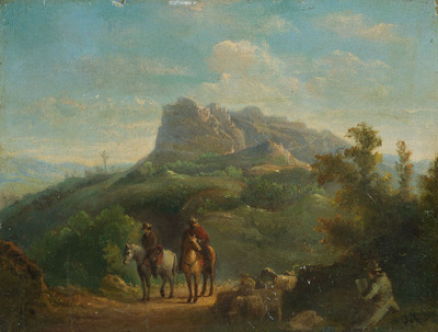 Zwei Reiter in bergiger Landschaft. Am Wegrand lesender Wanderer