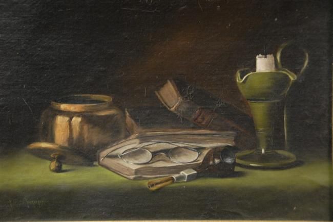 STILL LIFE WITH PIPE, BOOK AND GLASSES