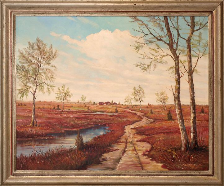 Weite, norddeutsche Moorlandschaft mit blühenden Erika und vereinzelten Birken.