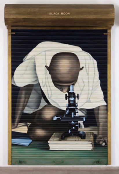 | Enamel paint on metal roller shutters and acrylic and marble dust on canvas | |