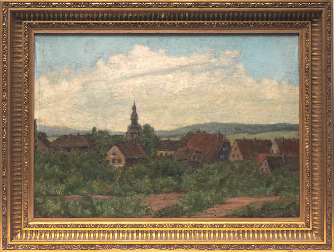 | Blick auf Alt-Brake bei Lemgo, umgeben von Laubwäldern, im Hintergrund die Höhenzüge des Lipper Berglandes | |