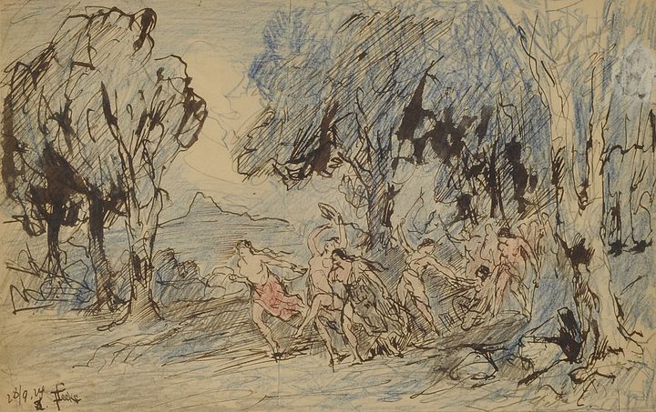 Waldlandschaft mit Zug von Amazonen. Vermutl. Illustration (Entwurf) zu Richard Wagner