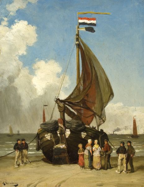 | Fishing boat on the shore with figures standing around, North Sea coastal scene, other fishing boats and a steamship at sea und | |