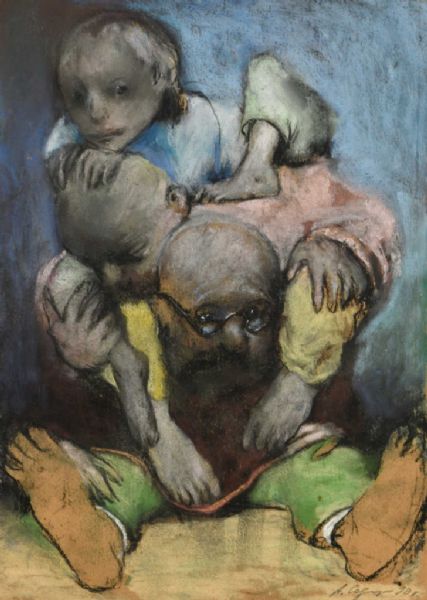 Vieillard et deux enfants.
