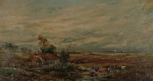 Cattle watering by a cottage