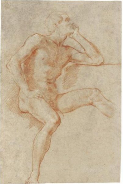 | RECTO: STUDY OF A MALE NUDE, SEATED, RESTING HIS CHIN ON HIS LEFT HAND; VERSO: A MALE NUDE IN PROFILE CLIMBING A STAIRCASE, A SE | |