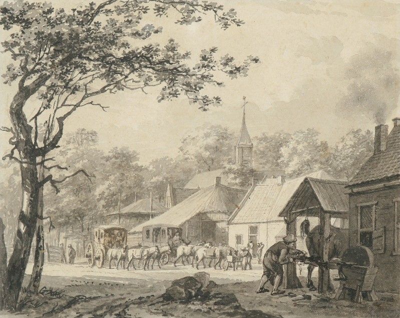 | Coaches at a stage, at the right an old forge with a horse being shod | |