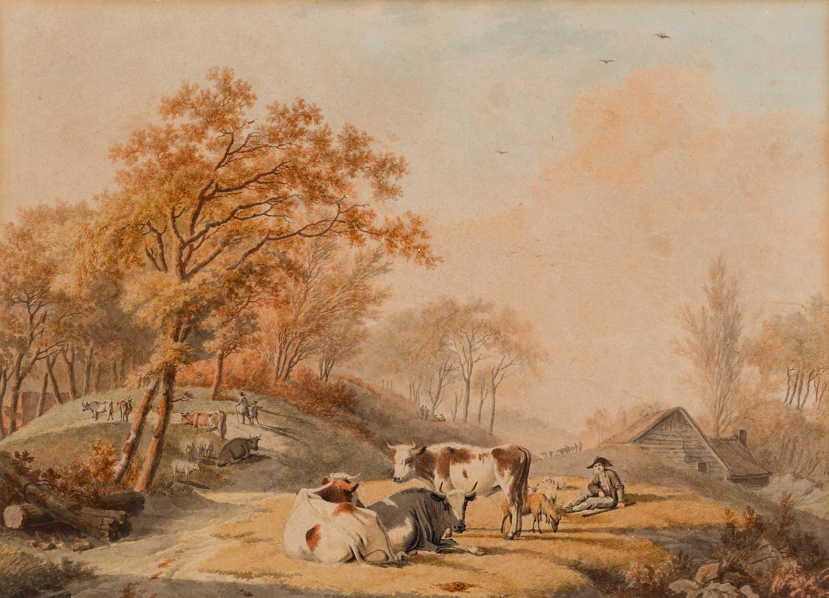 Rolling landscape with farmers and their cows and sheep