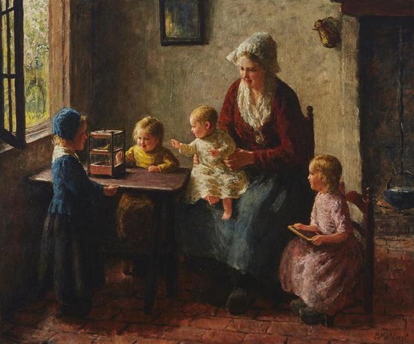 MOTHER AND CHILDREN WITH BIRD CAGE
