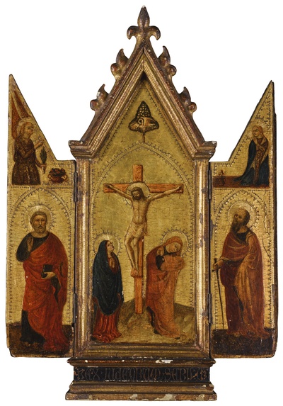 | A PORTABLE TRIPTYCH, WITH THE CRUCIFIXION, THE ANNUNCIATION, TWO SAINTS AND THE PELICAN IN HER PIETY | |