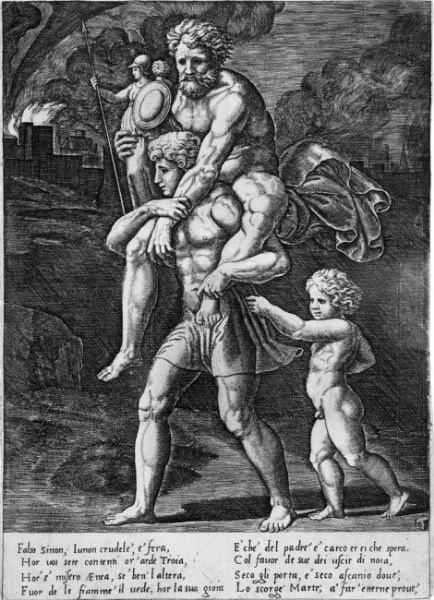 Eneasz wynoszący ojca Anchizesa z płonącej Troi