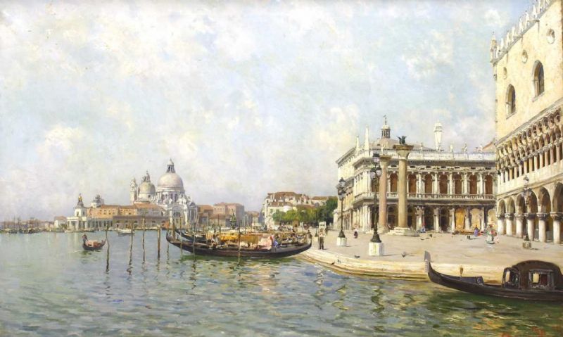 | Venedig. Ansicht von der Lagunenseite mit Gondeln und Blick auf Santa Maria della Salute. | |