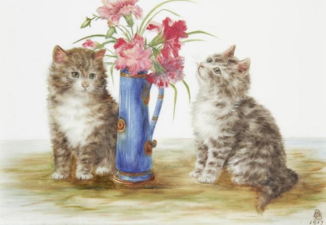 Kittens with flower vase; Kittens with balls of thread, a pair