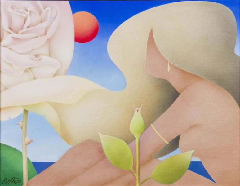 female nude seated beside a rose bud and blooming rose, beneath glowing sun