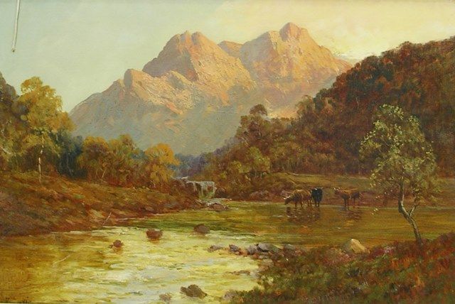 Long Horn Cattle watering in Highland river shallows, with sun drenched hills beyond