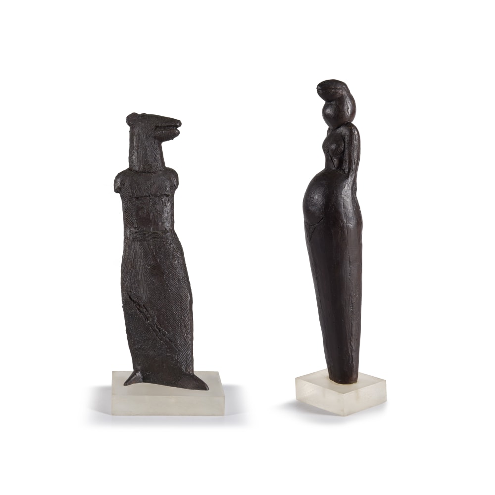 each height: 33cm excluding base, 35,5cm including base; (1) width: 11cm; depth: 6cm; (2) width: 6cm; depth: 6cm and numbered 1/6 on the base | |