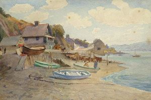 Dinghies on a beach with a tranquil harbour village and loch beyond